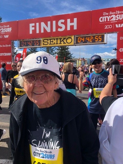 “Enid completed her first City2Surf event when she was 93,” says Ruth Webster, Enid’s daughter-in-law. Enid has participated every year since, except 2018 when she was registered but was too unwell to walk on the day.