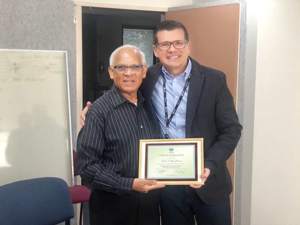 After 14 years as manager of the ADRA Community Care Centre at Blacktown, Pastor Eddy Johnson retired in early 2021. COVID restrictions delayed a formal farewell, but Conference ADRA Director Malcolm Rea hosted a luncheon on May 26 (before the most recent COVID-19 lockdown) in Eddy’s honour. Denison Grellmann, CEO of ADRA Australia, presented Johnson with a plaque for his years of faithful service and wished him well as he takes up the new honorary chaplain role at the centre.