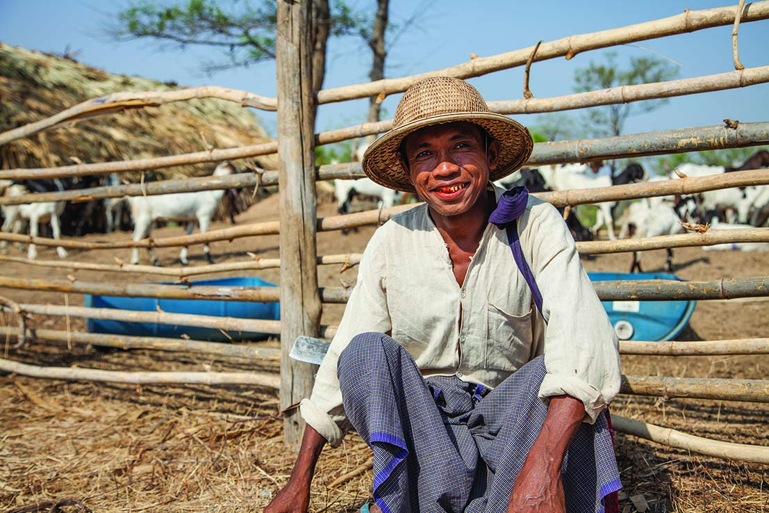 Two hours drive from this historic site, Thein Paing is herding his goats in the dusty plains near his village in Myanmar’s infamous Dry Zone. It is only eight o’clock in the morning and already the air is dry and hot. Goats and cattle graze among the tufts of hay-coloured grass and near-bare trees scatter the landscape. All natural water sources, it seems, have long since dried up. It’s hard to understand how anyone could make a living out here. Thein is a generous-spirited man. He smiles easily, showing his toothy grin.